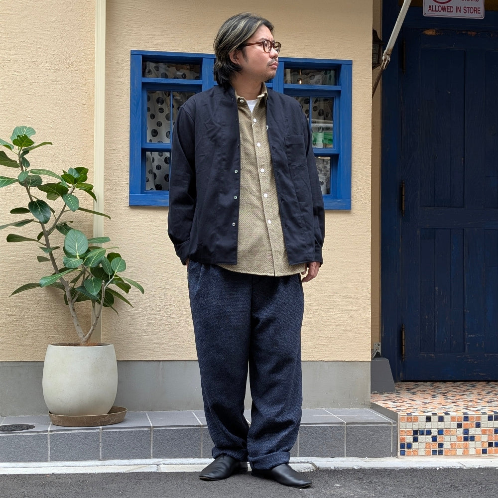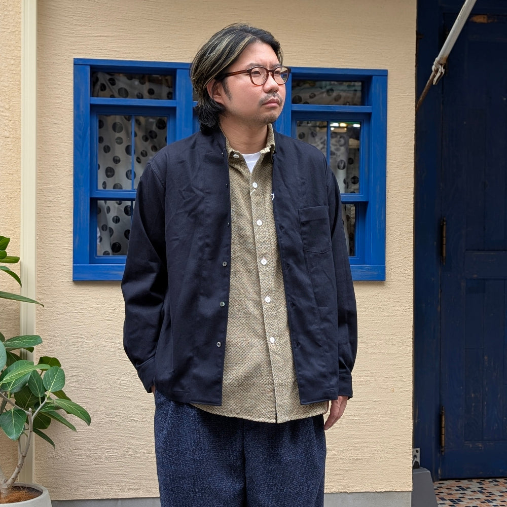 This shirt has a “BYE (good-bye collar)” design, with the collar of the open-collared shirt cut off. The material used is brushed cotton twill. The slightly thicker fabric has a slightly brushed feel and is smooth against the skin. This shirt has a comfortable feeling for autumn and winter.