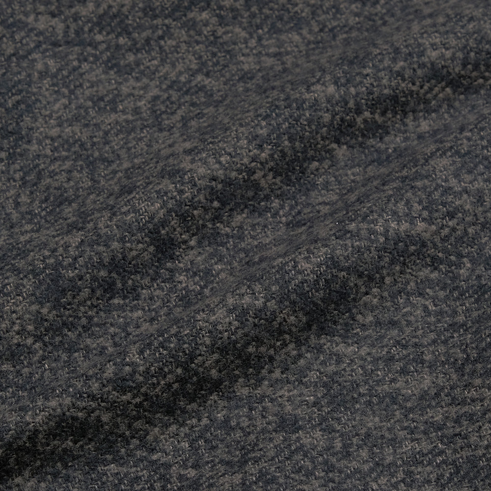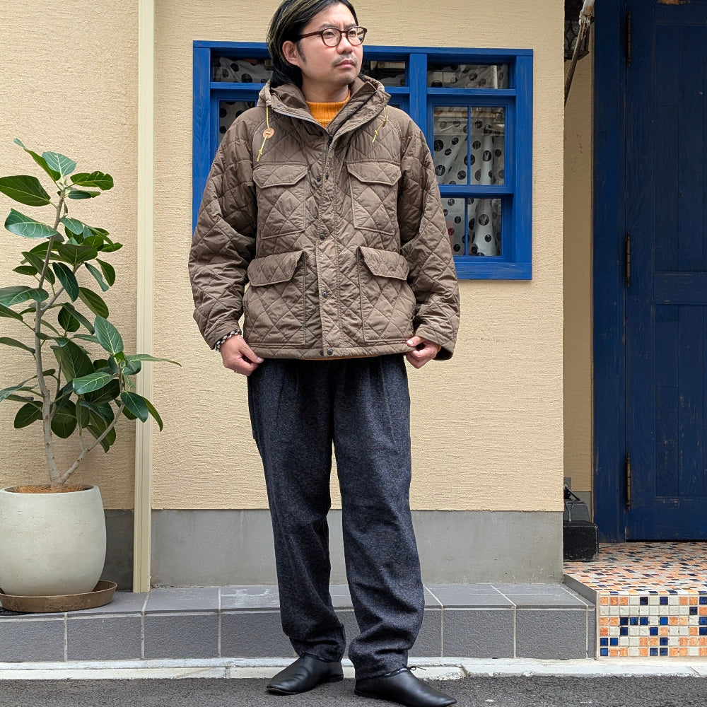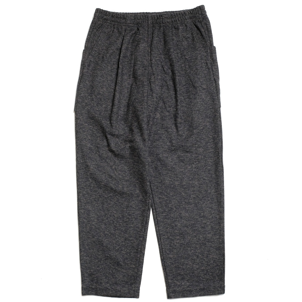 These umps pants feature a tweed weave with 100% cotton three-color yarn twisted. Using open-end yarn prevents the typical heaviness of cotton, and the material is slowly and carefully brushed using an old-style brushing machine to achieve a wool-like texture. This fabric is suitable even for those who dislike wool. The design is inspired by the silhouette around the waist of a baseball umpire, featuring large, gusseted pockets reminiscent of those used to hold spare balls. The waist is designed to be relaxed, tapering strongly towards the hem for a clean look. The waist can be adjusted with elastic and a drawstring.