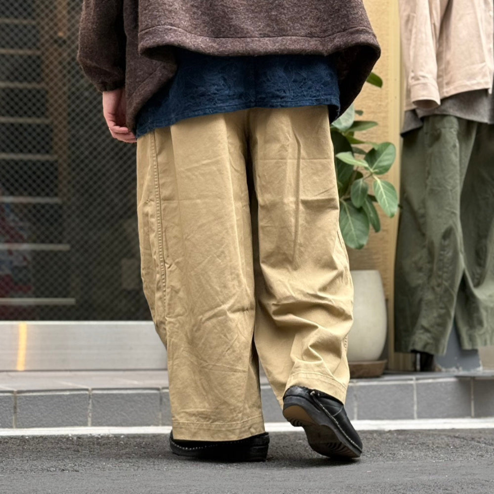 The H.D. PANT is a popular item with a unique silhouette with a large bulge at the front due to darts at the waist and hem. The relaxed silhouette and open, comfortable fit are also attractive. The basic design, based on simple chino trousers, makes these pants suitable for any season.
