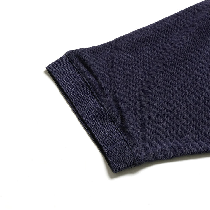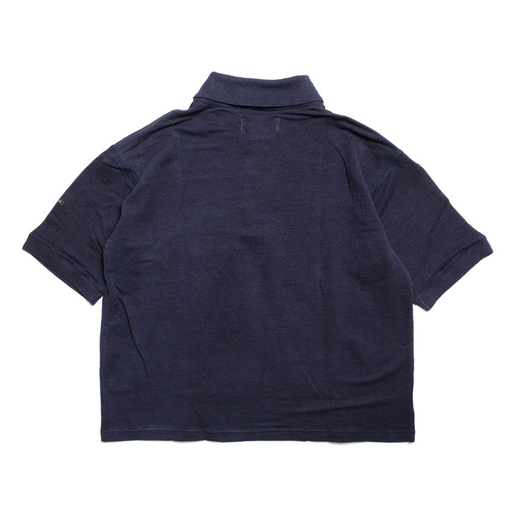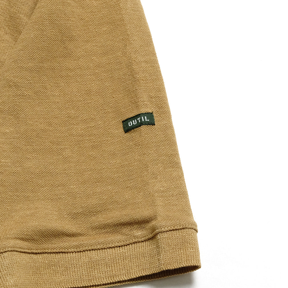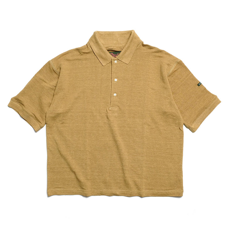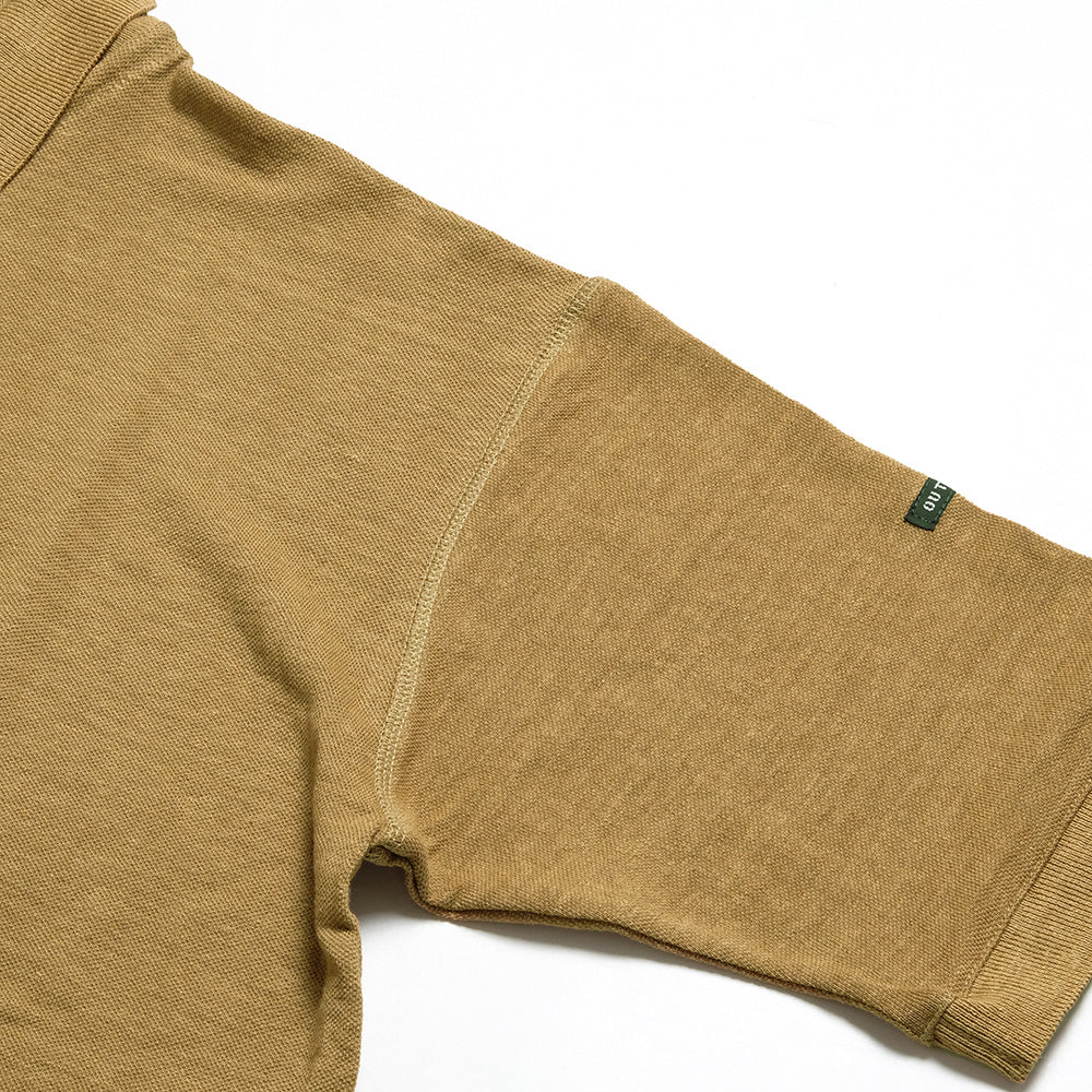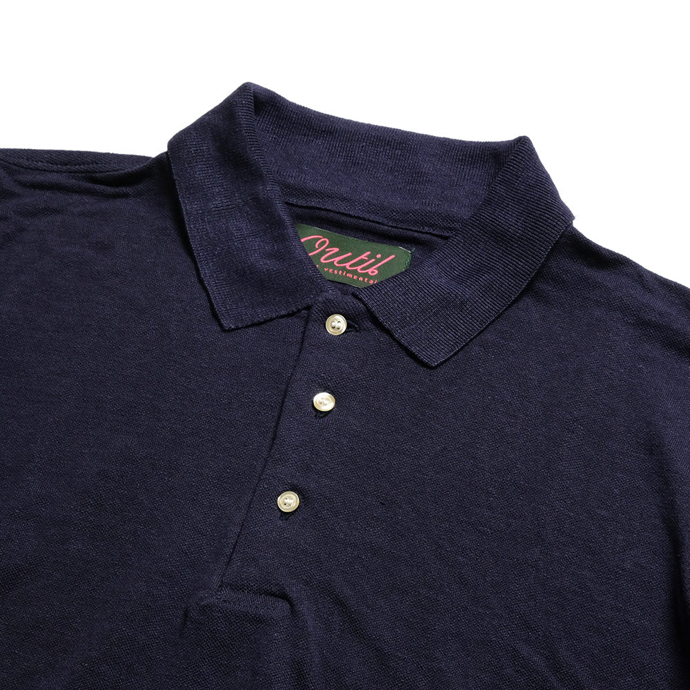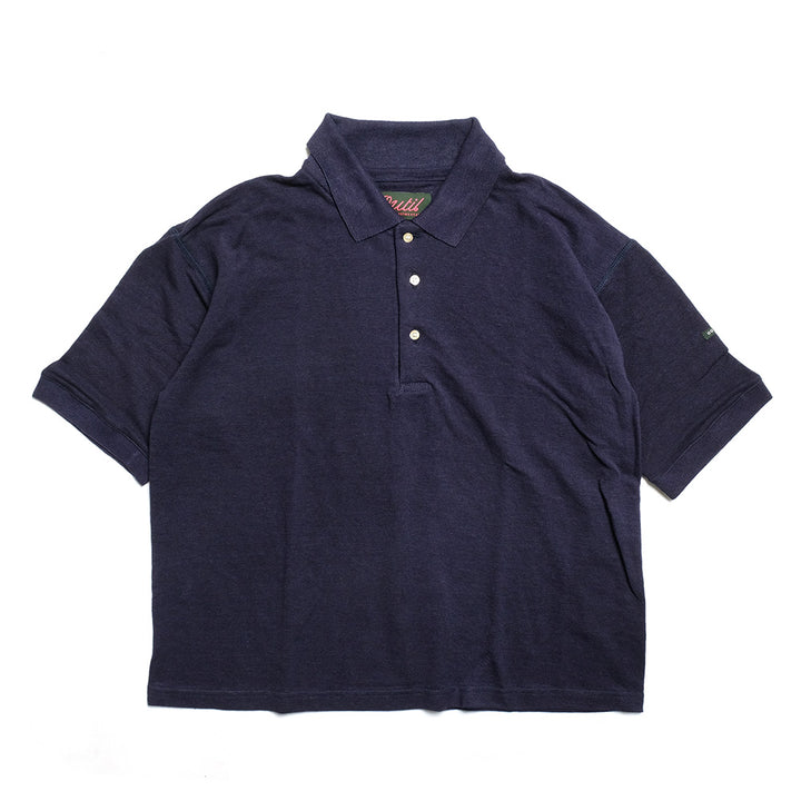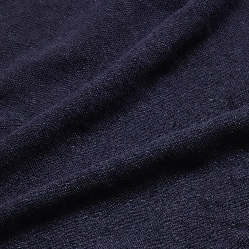 This linen polo shirt is based on a vintage French polo shirt. It has a box silhouette with longer sleeves. It is made of a seed-stitch fabric knitted based on vintage sports underwear. All processes, yarn dyeing, knitting, cutting, and sewing, are done in the same factory in the Basque region of France.