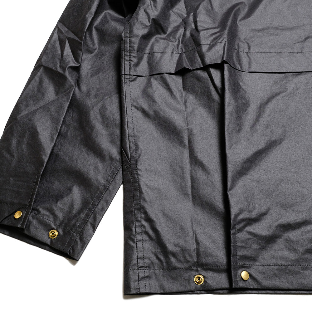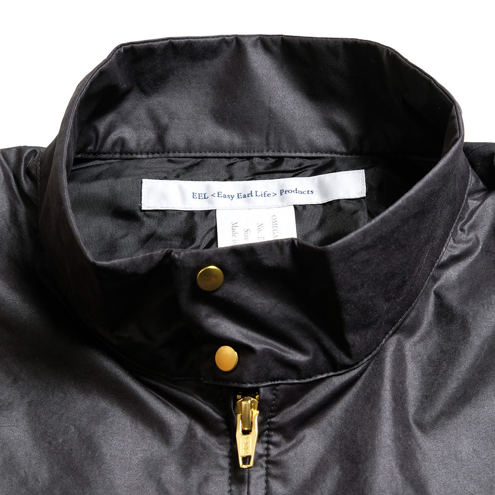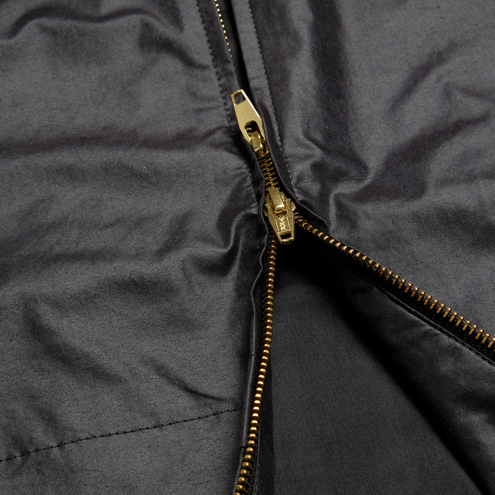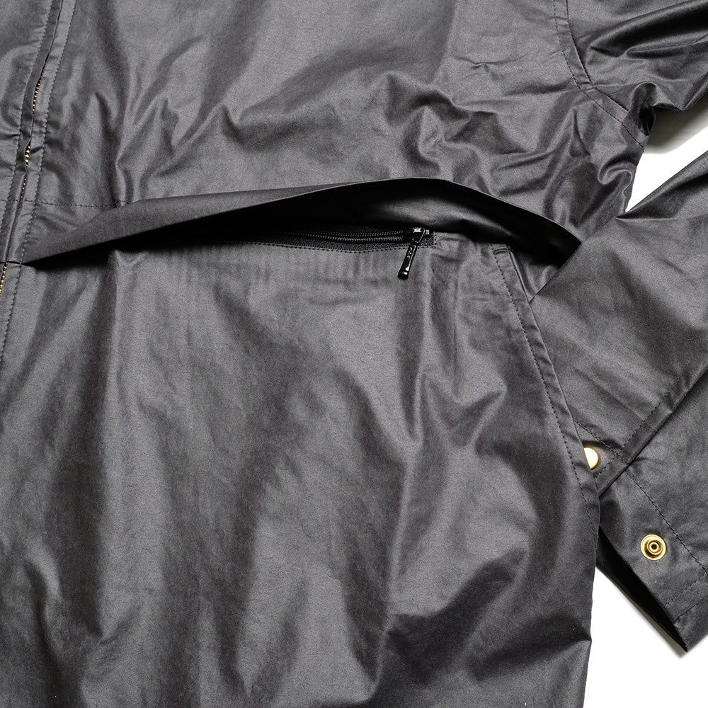 高密度に織り込んだ軽量ポリエステルナイロンツイルを使用したブルゾン。撥水光沢加工を施し、オイルドコットンを思わせるようなクラシックな表情になりながらも、軽快さと機能性を兼ね備えています。ゆったりした身幅に、運転中の姿勢でも小物の出し入れがしやすいように、左側の腰よりもやや高い位置にジップポケットを配置。ダブルジップを採用することで、裾捌きも良くなっています。