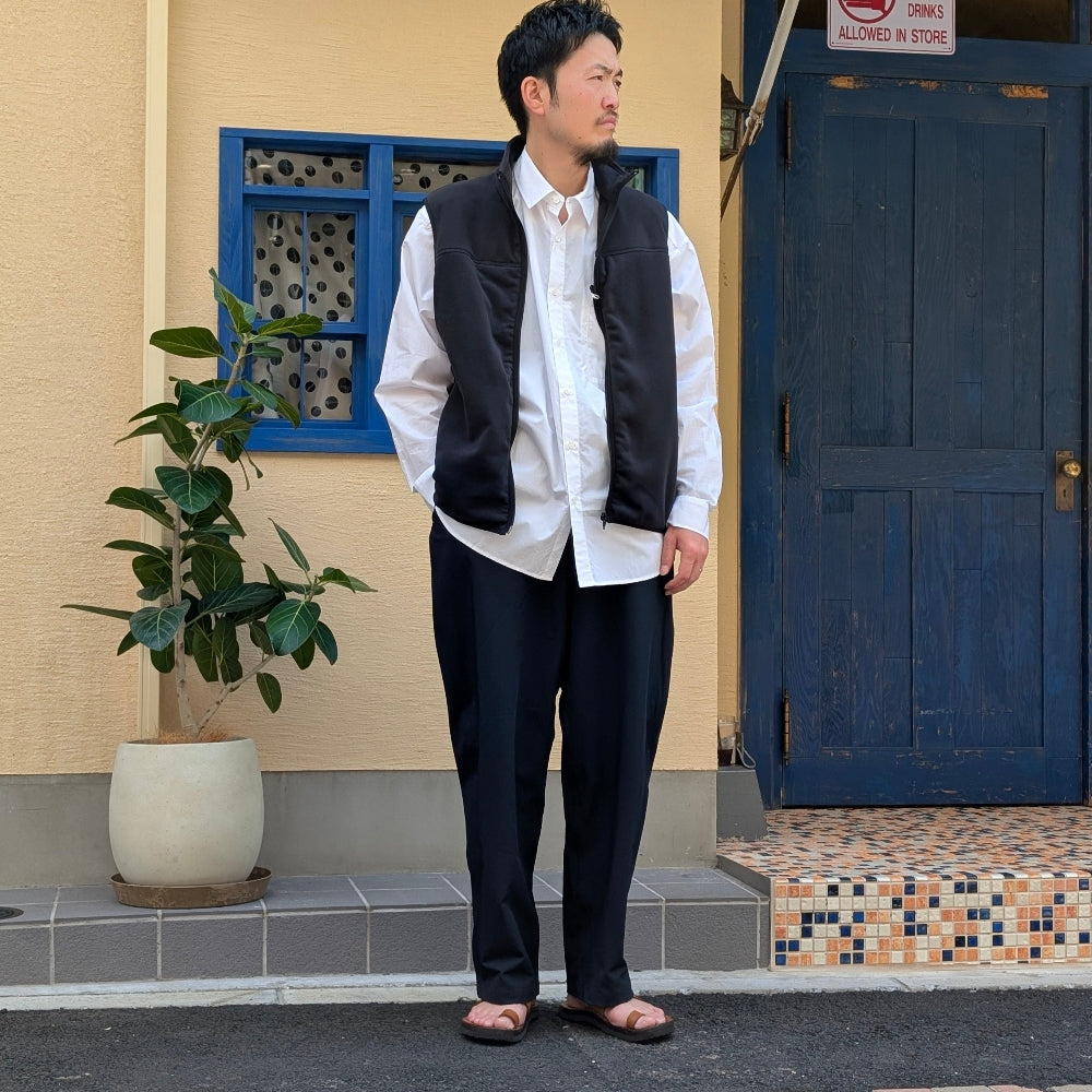 リサイクルポリエステルストレッチツイルを使用したワイドテーパードパンツ
