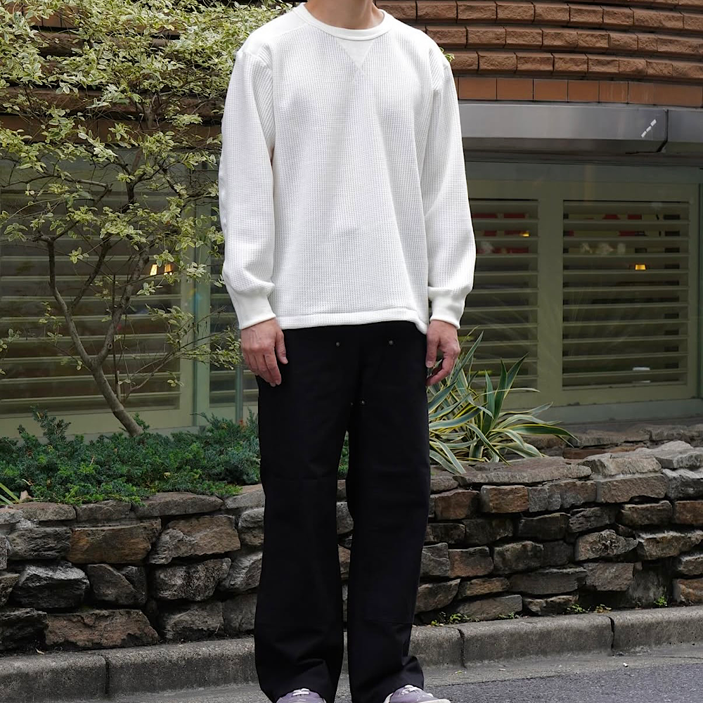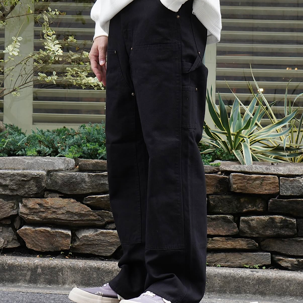 力強いワイドストレートシルエットに、工具などを収納するポケットやダブルニー仕様などオーセンティックなデザインのペインターパンツ。多数のリベットや無骨なディテールにマッチしたコットンキャンバス素材を使用が、ヴィンテージ感のある風合いを引き出しています。