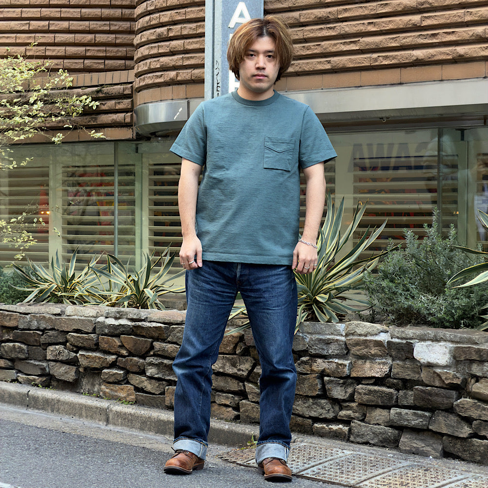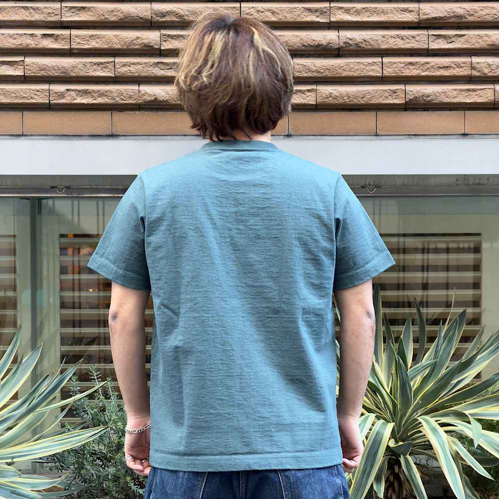 透けない、汗染みが目立ちにくいといった見栄えの安心感があるTシャツです。アメリカ産のコットンを吊り編み機を使用して編み立てたドツメ天竺素材を使用。均等に極限まで度目を詰めることができる吊り編み機を使用し編み立てた約11.5オンスの極厚素材。着用と洗濯を繰り返しても縮みやゆがみが起こりにくいのが特徴です。身生地に負けない、しっかりした厚みのリブを使用し、ポケットは、1900年代初頭のBaseballユニフォームのポケットをモチーフにホームベース型の表見返し仕様に。従来のドツメTシャツに比べて、肩巾と身巾をやや拡げ、着丈は長く修正したりと全体のバランスを考えた正統派のT-Shirtに仕上げました。