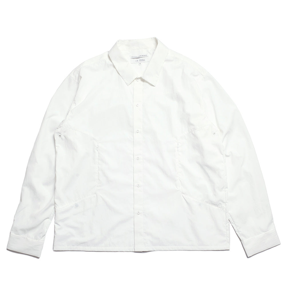 防水性、防風性が備わり、かつ軽量に着用できる素材感が特徴のL/Sシャツ。衿部分のボタンを使用することでスタンダードカラー仕様に。またフロントにはコンシールファスナーとシークレットポケットを採用しており大容量かつ機能面にも優れています。アームホール下部分に通気口のハトメを追加することで雨天時などでも保温性と通気性のバランスを保つ設計になっています。