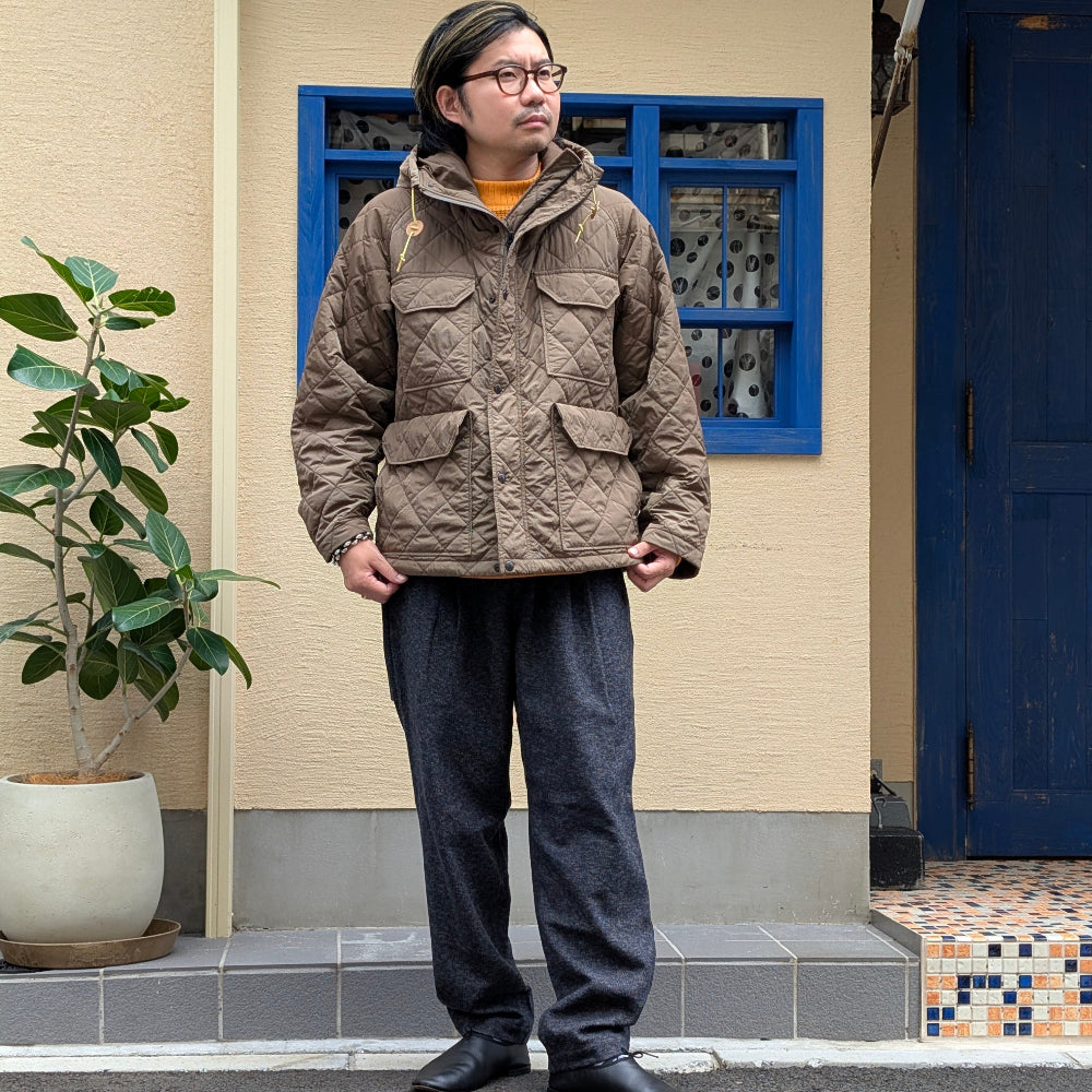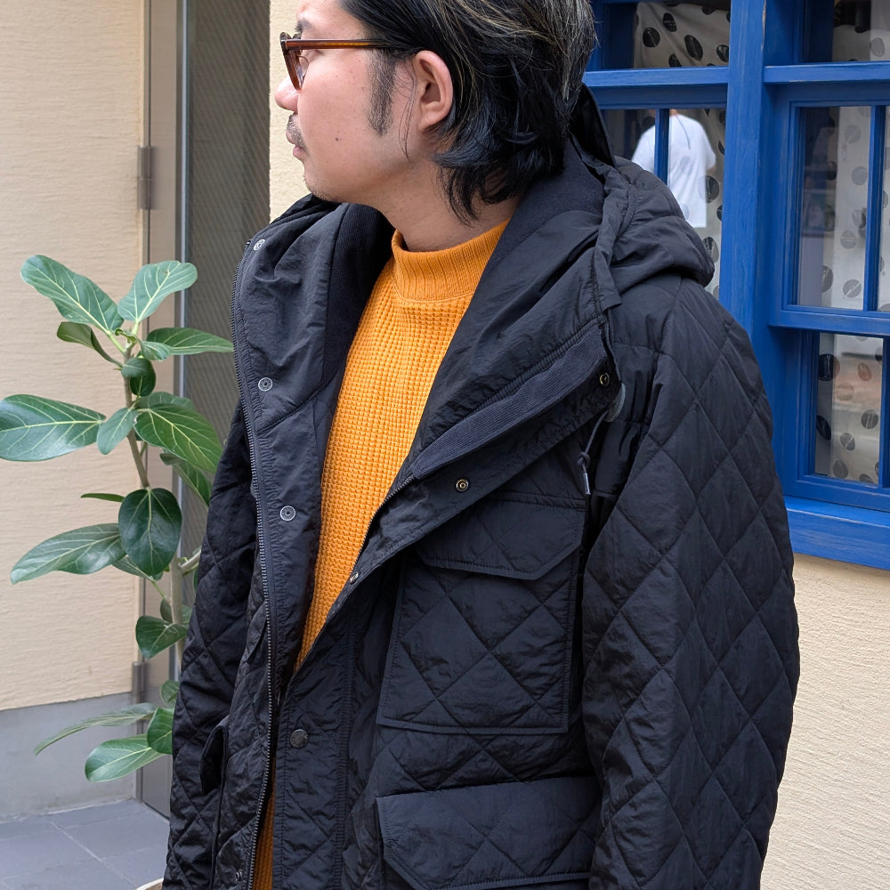リサイクルナイロンのキルティング素材を使った、保温性とデザイン性を兼ね備えたフィールドマウンテンパーカ。