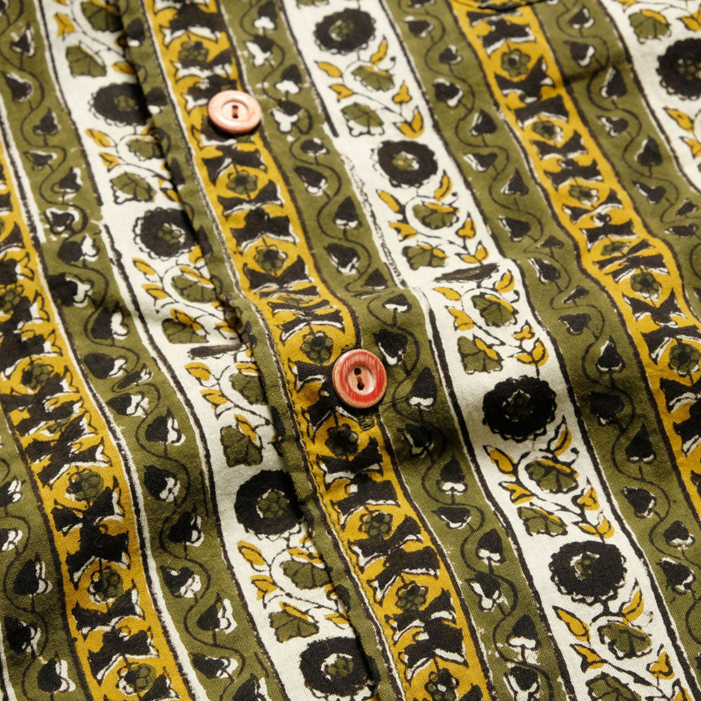 エキゾチックなバティック染め生地を使ったオープンカラーシャツ。インドの植物をモチーフにしたバティックプリントは、一つ一つ風合いが異なり素朴な雰囲気。コットン100%のボディはとても軽く、ふんわりとした質感です。シルエットはスッキリとした着丈のボックス型。落ち着いた色合いですが、強い日差しの中で映えるシャツです。